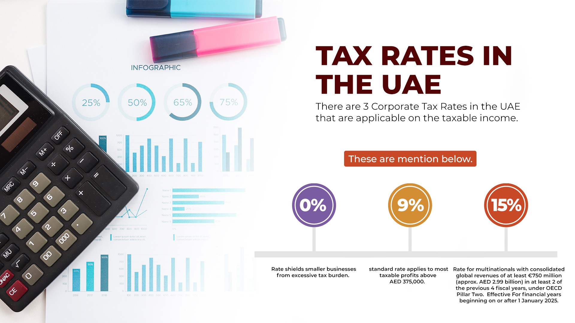 - 9% standard rate applies to most taxable profits above AED 375,000.